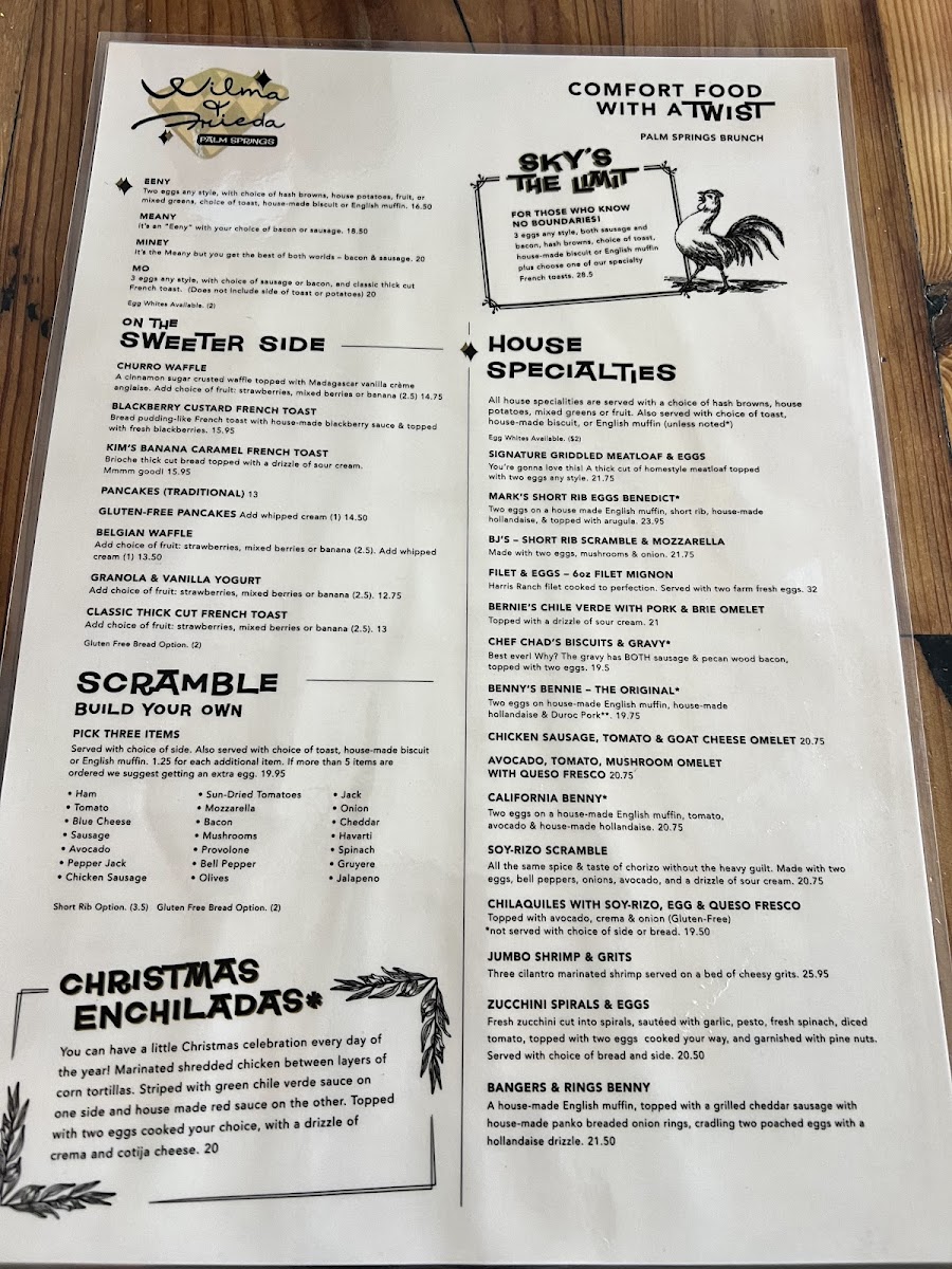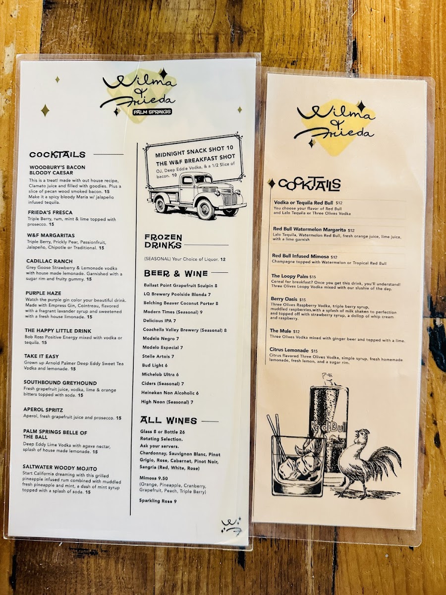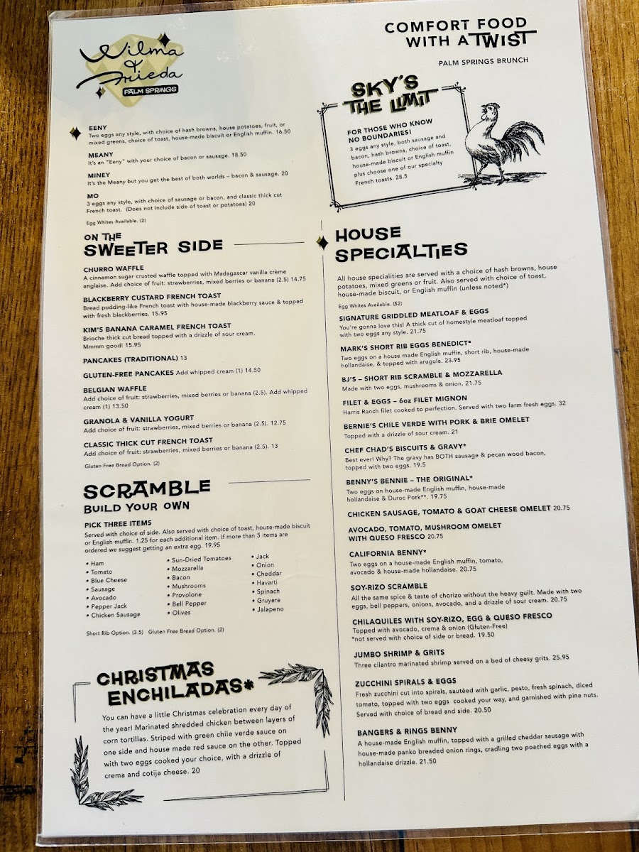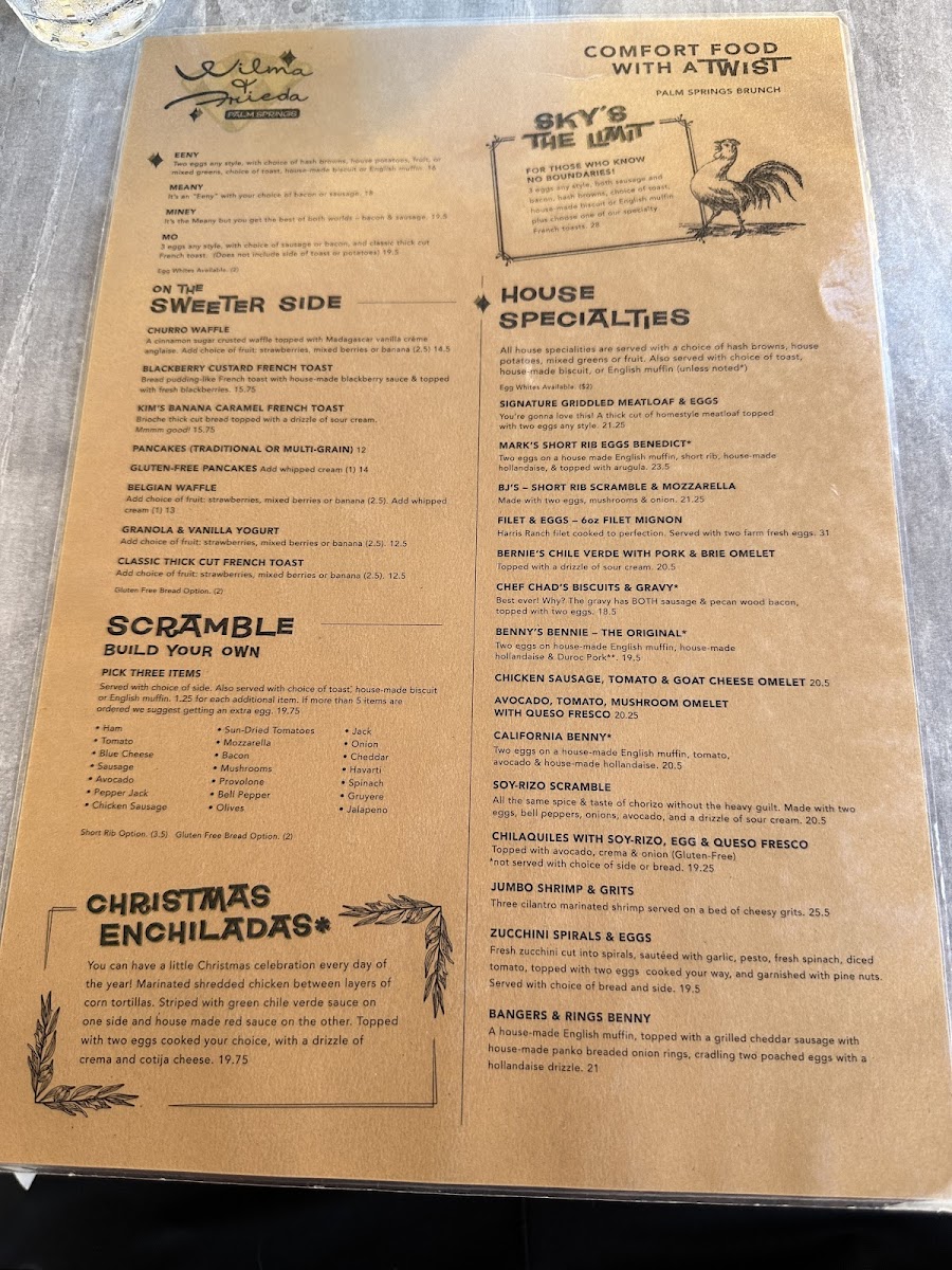 Wilma & Frieda's - Palm Springs is a must-visit culinary gem located at 155 S Palm Canyon Dr. Renowned for its innovative brunch menu, the restaurant excels in offering generous portions of classic American breakfast favorites, like the indulgent "Sky's the Limit"—a protein-packed delight featuring eggs, bacon, sausage, and hash browns. Diners rave about the exceptional service set against a charming backdrop, whether inside or on the scenic second-floor balcony. Signature dishes, including homemade biscuits and fresh berry-laden waffles, round out a delightful experience. With a full-service bar and complimentary parking, Wilma & Frieda's makes every meal an occasion to savor.